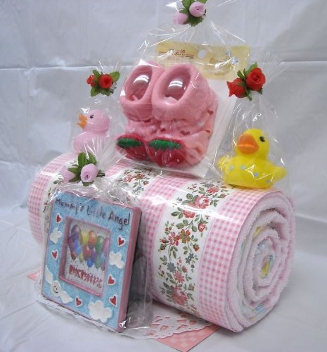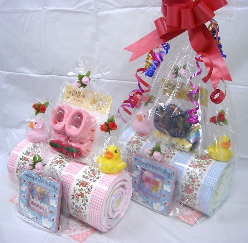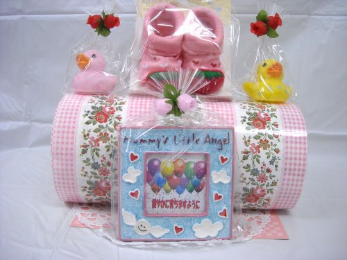 話題のロールケーキ風にアレンジされたオムツケーキです。個別包装されたおむつをクリームに見立て、スポンジケーキに見立てたバスタオルで包みました。。 男の子用にマスカットケーキ、女の子用にストロベリーケーキをご用意しました。それぞれに、ベビーソックス、フォトフレーム、おもちゃが付いています。 (フォトフレームに名前やメッセージ記入ご希望の方は、20字程度以内の文言をご連絡下さい) シーズンや作成時期により、使用するお花や付属品などが多少変わる事もございますが、全体のイメージが大きく変わることはございません