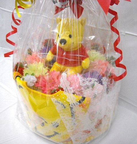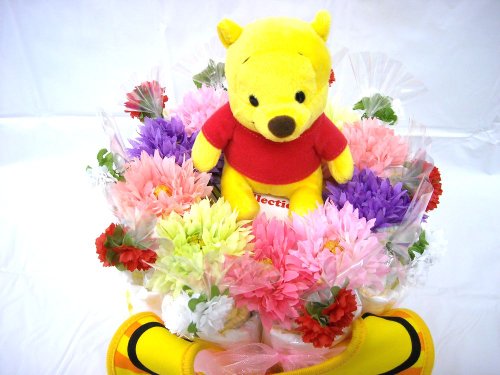 男の子にも女の子にも喜ばれる「くまのプーさん」。男女共用に使える出産祝いのベビーギフトですよ。可愛いプーさん柄のベビービブが付いています。 シーズンや作成時期により、使用するお花や付属品などが多少変わる事もございますが、全体のイメージが大きく変わることはございません。