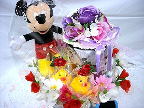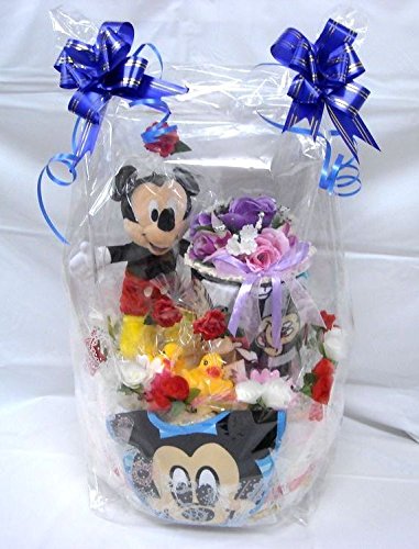 男の子用にミッキー、女の子用にミニ―ちゃんをご用意しました。それぞれに、ベビービブとフェイスタオルが付いています。 シーズンや作成時期により、使用するお花や付属品などが多少変わる事もございますが、全体のイメージが大きく変わることはございません。