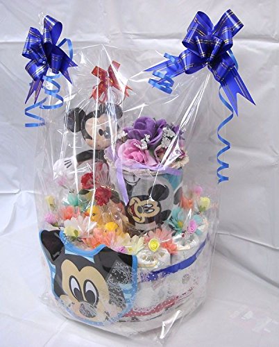 - おむつケーキは飾ってお楽しみいただける様に全体を透明セロファンでカバーし、リボンラッピングしてございます (リボンラッピング後の高さ、約48cm)おむつケーキお渡し時にご利用頂ける、白地のペーパーバッグを同梱いたしております。