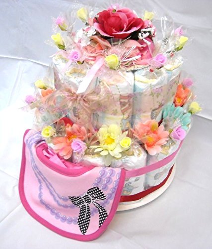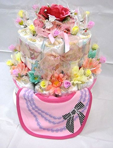 ご出産お祝い <おむつケーキ>リーズナブルなお値段のかわいいおむつケーキ「2段おむつケーキ」(女の子用ピンク系)