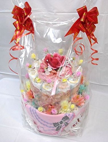 - おむつケーキは飾ってお楽しみいただける様に全体を透明セロファンでカバーし、リボンラッピングしてございます (リボンラッピング後の高さ、約45cm)おむつケーキお渡し時にご利用頂ける、白地のペーパーバッグを同梱いたしております。
