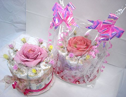 - おむつケーキサイズ : 直径約18cm 高さ約18cm(作成時期によりお花のデザイン等が変更になる場合がございます。ご了承くださいませ)