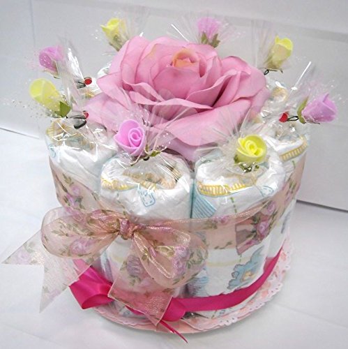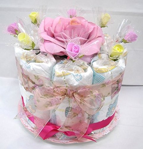 ご出産お祝い<おむつケーキ> リーズナブルなお値段のかわいいおむつケーキ フラワーA (女の子用ピンク系リボン)