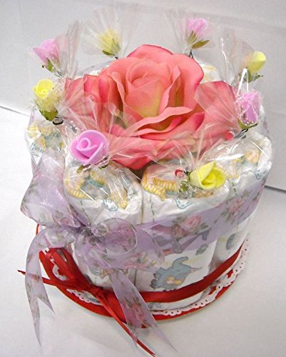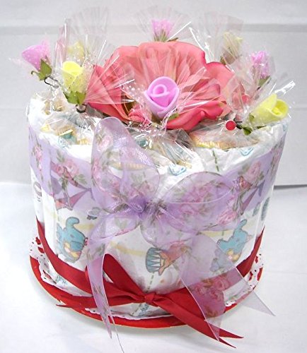 ご出産お祝い<おむつケーキ> リーズナブルなお値段のかわいいおむつケーキ フラワーA (男女共用レッド系リボン)