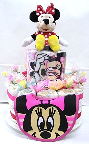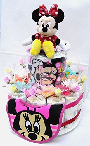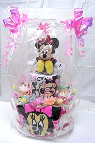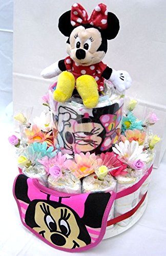 ご出産お祝い<おむつケーキ> 可愛いくってボリューム感たっぷりな人気の「2段おむつケーキ」 ディズニーM (女の子用ミニー)おむつ30枚使用の豪華版