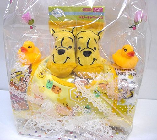 男女共用ギフトとして人気のくまのプーさんをご用意しました。可愛いベビーソックスとベビービブが付いています。 シーズンや作成時期により、タオルやソックス等の柄、使用するお花や付属品などが多少変わる事もございますが、全体のイメージが大きく変わることはございません。