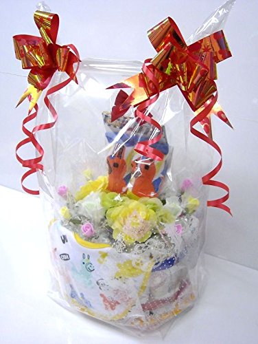 - おむつケーキは飾ってお楽しみいただける様に全体を透明セロファンでカバーし、リボンラッピングしてございます (リボンラッピング後の高さ、約45cm)おむつケーキお渡し時にご利用頂ける、白地のペーパーバッグを同梱いたしております。