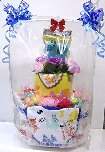- おむつケーキは飾ってお楽しみいただける様に全体を透明セロファンでカバーし、リボンラッピングしてございます (リボンラッピング後の高さ、約48cm)おむつケーキお渡し時にご利用頂ける、白地のペーパーバッグを同梱いたしております。