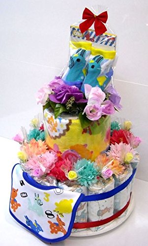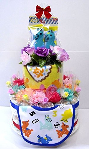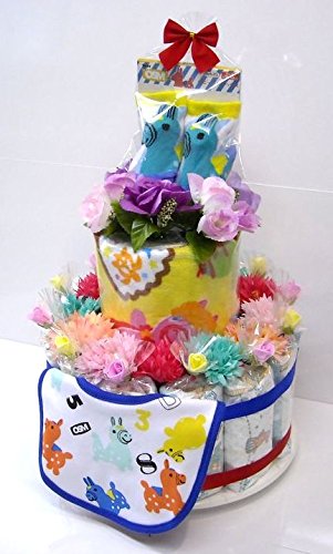 - おむつケーキサイズ : 直径約26cm 高さ約40cm かわいいベビービブ付き(制作時期により、ビブやタオル、フラワー等の付属品のデザインや柄が変更になる場合がございます。ご了承下さいませ。)