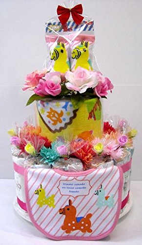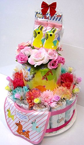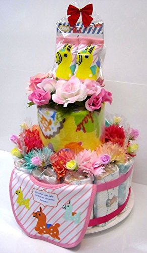 - おむつケーキサイズ : 直径約26cm 高さ約40cm かわいいベビービブ付き(制作時期により、ビブやタオル、フラワー等の付属品のデザインや柄が変更になる場合がございます。ご了承下さいませ。)