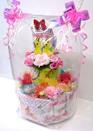 - おむつケーキは飾ってお楽しみいただける様に全体を透明セロファンでカバーし、リボンラッピングしてございます (リボンラッピング後の高さ、約48cm)おむつケーキお渡し時にご利用頂ける、白地のペーパーバッグを同梱いたしております。