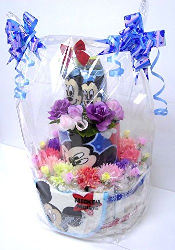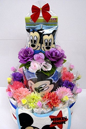 男の子用にミッキー、女の子用にミニー、男女共用にくまのプーさんをご用意しました。それぞれに、ベビーソックスとベビービブフェイスタオルが付いています。 シーズンや作成時期により、使用するお花や付属品などが多少変わる事もございますが、全体のイメージが大きく変わることはございません。