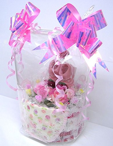 こちらは女の子用の商品です。(男の子用にブルー系、女の子用にピンク系をご用意しました。)それぞれに、可愛いベビーソックスとベビービブが付いています。 シーズンや作成時期により、使用するお花や付属品などが多少変わる事もございますが、全体のイメージが大きく変わることはございません。