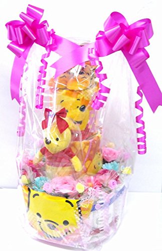 男の子用にミッキー、女の子用にミニー、男女共用にくまのプーさんをご用意しました。それぞれに、ベビーソックスとベビービブ、ヌイグルミ、ハンドタオル、フェイスタオルが付いています。 シーズンや作成時期により、使用するお花や付属品などが多少変わる事もございますが、全体のイメージが大きく変わることはございません。