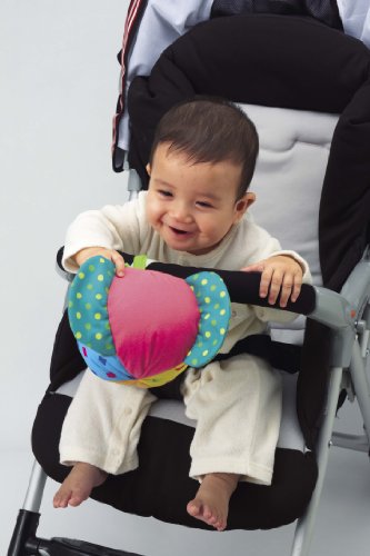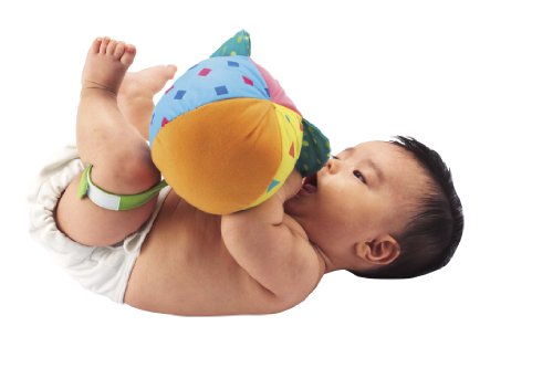 4ヶ月頃、仰向けで手足を高く上げ、手で足をつかんだりバタバタさせたりします。これは寝返りを促す筋力の発達行動の1つ。ベルトであんよに固定できるから、普通のボールと違って、ボールをお手てでぐいーんとひっぱり、遊びながら腹筋と背筋が鍛えられます。