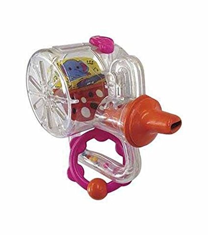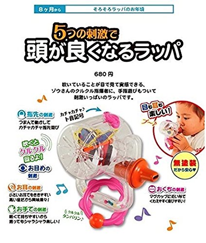 吹いたときに音が鳴り、イラストがくるくる回るので耳も目も楽しめます。 つまんで動かして指先遊びができる「カチャカチャト音記号」や、さわって楽しい「クルクルタンバリン」も加わり、目・くち・耳・指先・お手てを刺激する知育ラッパに大変身!