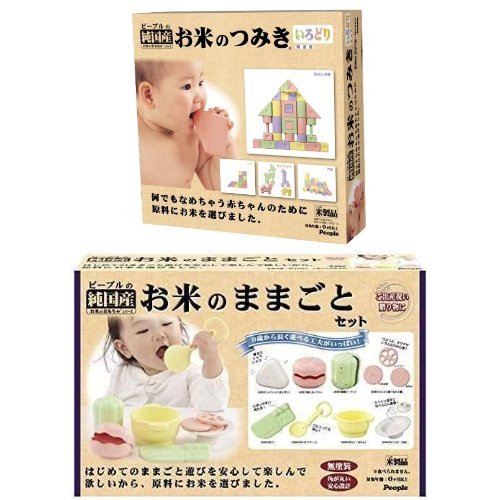 お米でできたおもちゃのシリーズ。つみきとままごとのセット。