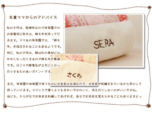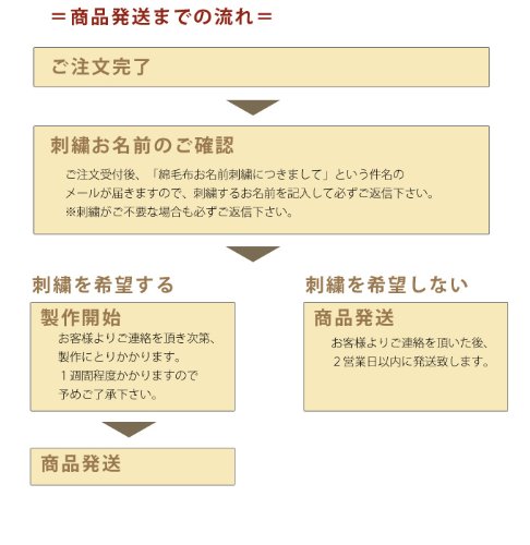 【重要】ご注文確認後、当店より「名入れ商品お名前刺繍につきまして」という件名にてメールをお送り致します。 そのメールを必ずご確認頂き、ご返信下さい。 ご返信頂けない場合はご注文をキャンセルさせて頂く場合がございます。 お名前の刺繍がご不要な場合にも、ご返信をお願い致します。