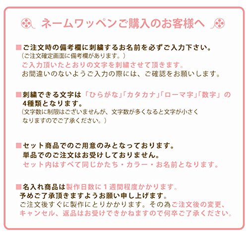 【重要】ご注文確認後、当店より「名入れ商品お名前刺繍につきまして」という件名にてメールをお送り致します。 そのメールを必ずご確認頂き、ご返信下さい。 ご返信頂けない場合はご注文をキャンセルさせて頂く場合がございます。 お名前の刺繍がご不要な場合にも、ご返信をお願い致します。 入園入学準備にピッタリ★ 他にはない可愛いデザインで目立つこと間違いなし♪ 刺繍で名入れするので、マジックみたいに、文字が消えてしまうこともありません。