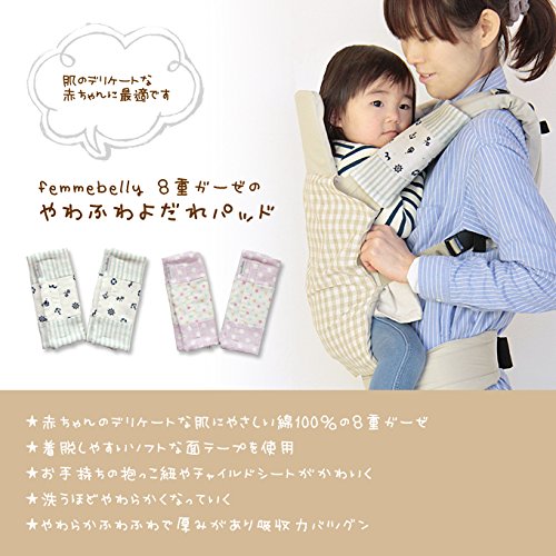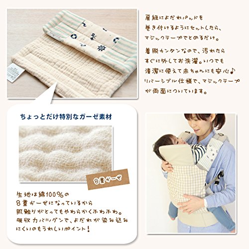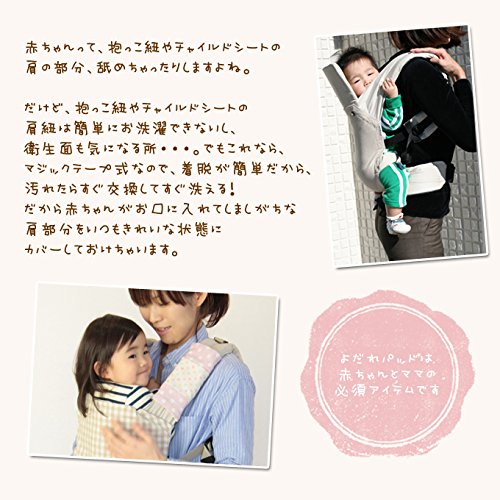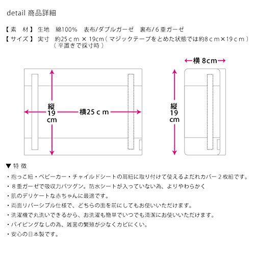 抱っこ紐・ベビーカー・チャイルドシートの肩紐に取り付けられるベビーのよだれパッド2枚組です。 赤ちゃんって肩紐をすぐなめちゃいますよね・・・ チャイルドシートなど、気軽に洗えないし、でも衛生面も心配。 ベルト部分が、赤ちゃんの顔にあたってこすれてしまい、肌荒れの原因になることも。 そんな時、肩紐カバーはとっても便利♪ しかも、8重ガーゼ生地でやわらかふわふわ★肌のデリケートな赤ちゃんに最適◎リバーシブル仕様なので、どちら面でもお使い頂けます。 よだれが染み込む心配がありません。丸洗い可なのでお洗濯も簡単。表面はコットン100%。安心の日本製。