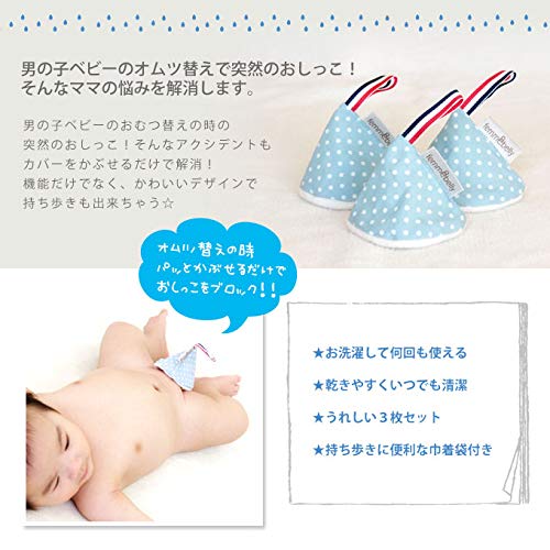 かわいい三角帽子が突然のおしっこをブロック♪ 男の子のママなら、経験した人も多いはず・・・ おむつ替えの時の突然のおしっこ!! そんな時、このカバーをかぶせるだけでおしっこをブロックできちゃいます☆ 機能だけでなく、可愛いデザインも◎ カバーは3枚組で巾着袋付きだから、お出かけにも便利♪