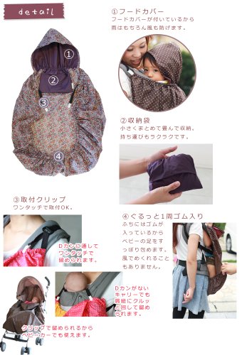 雨の日も楽しくお出かけ♪ベビーキャリーの上からサッと装着OK レインカバー 【商品詳細】 ①フードカバーがついているから雨はもちろん風も防げます。 ②収納袋が本体についているから小さく畳んで収納OK。持ち運びもラクラクです。 ③ワンタッチで取付OK。ベビーキャリーのDカンに通して留められます。Dカンがないベビーキャリーでも肩紐にクルッと回して留められます。 クリップで留めることができるからベビーカーでも使えます。 ④本体のふちには、ゴムが入っているからベビーの足をすっぽり包めます。風でめくれることもありません。