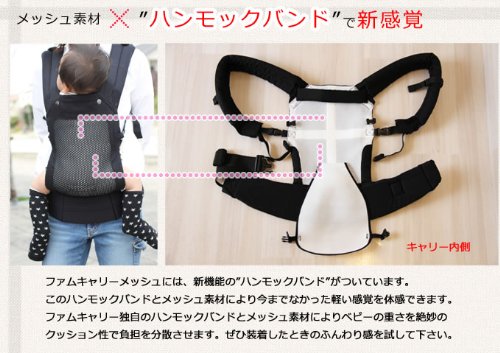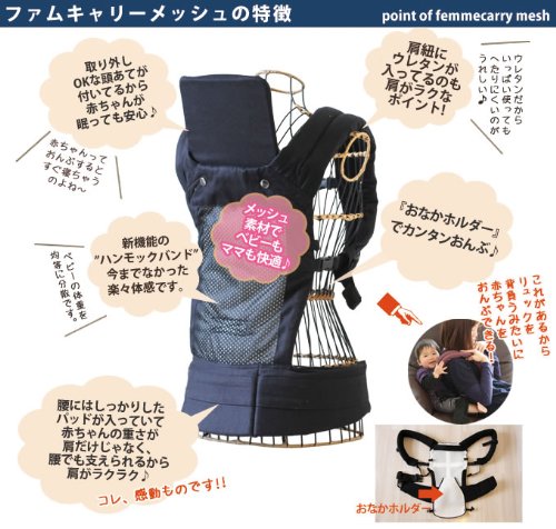 ファムキャリーがメッシュになって新登場! 今までのファムキャリーのいいところはそのままに最高級のメッシュ素材を採用してもっと快適に、もっとラクにお使い頂けるようになりました。 着せ替えできるキャリーだからその日の気分でスタイルチェンジ!パパと兼用で使いたい方やプレゼントにおすすめです。