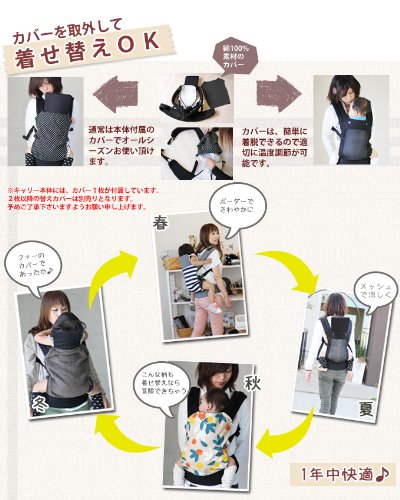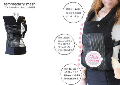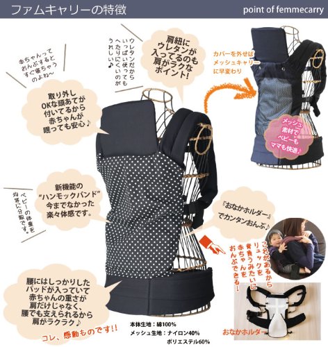 ファムキャリーがメッシュになって新登場! 今までのファムキャリーのいいところはそのままに最高級のメッシュ素材を採用してもっと快適に、もっとラクにお使い頂けるようになりました。 着せ替えできるキャリーだからその日の気分でスタイルチェンジ!パパと兼用で使いたい方やプレゼントにおすすめです。