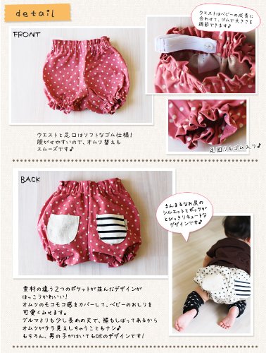 普通のボトムをはかせると、ベビーのオムツでおしりがモコっとしちゃって、なんだかおしゃれ度が半減。 ブルマは可愛いけど、裾の隙間からオムツがチラ見えしちゃってカッコ悪いし…そんなママの声を参考に、おむつの上からはくことを考え、ベビーのおしりが一番キュートに見えるように、そして1枚ではいた時も、オムツがはみ出ない少し長めの丈で、すそを絞ったデザインに…と何度も試作を重ねこだわりの形が完成しました♪綿麻素材は通気性も吸水性もよく、汗をかいても吸ってくれてべたつかずにサラリと気持ちよく過ごせます。