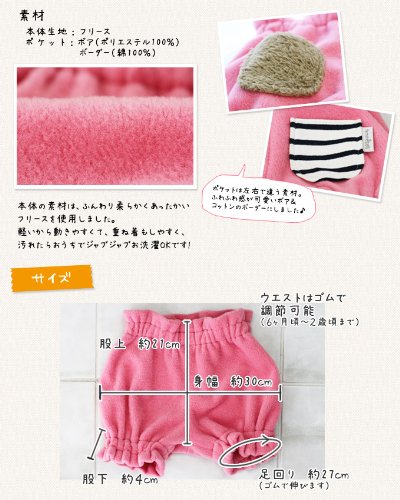 本体は軽くてあったかいフリース素材なので、秋と春はそのままはいて靴下やレッグウォーマーを合わせ、冬はレギンスやタイツを重ねればさらにあったか♪