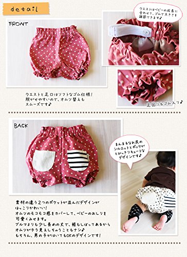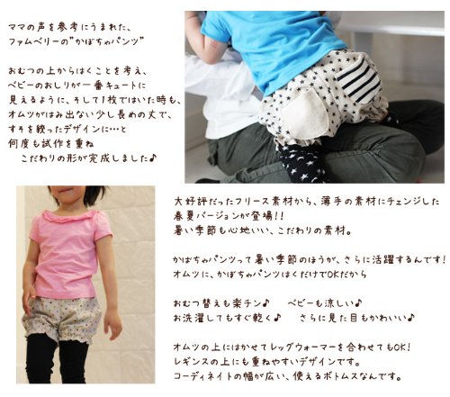 普通のボトムをはかせると、ベビーのオムツでおしりがモコっとしちゃって、なんだかおしゃれ度が半減。 ブルマは可愛いけど、裾の隙間からオムツがチラ見えしちゃってカッコ悪いし…そんなママの声を参考に、おむつの上からはくことを考え、ベビーのおしりが一番キュートに見えるように、そして1枚ではいた時も、オムツがはみ出ない少し長めの丈で、すそを絞ったデザインに…と何度も試作を重ねこだわりの形が完成しました♪通気性も吸水性もよく、汗をかいても吸ってくれてべたつかずにサラリと気持ちよく過ごせます。