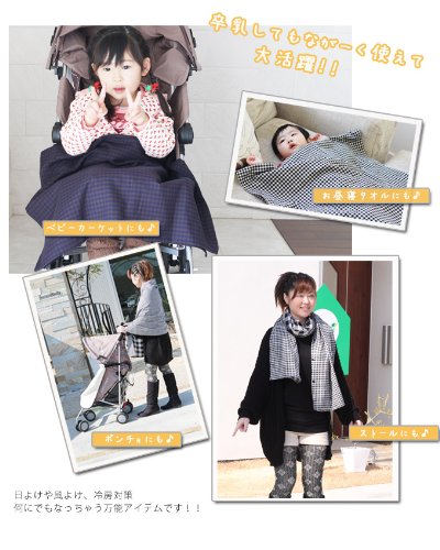 - 授乳ケープだけでなく、冬は防寒用のストールや夏は日よけ用のケープ、タオルケットやベビーカーケット、おくるみに・・シンプルな形だからいろんなシチュエーションで使えて1枚あるととっても便利です。