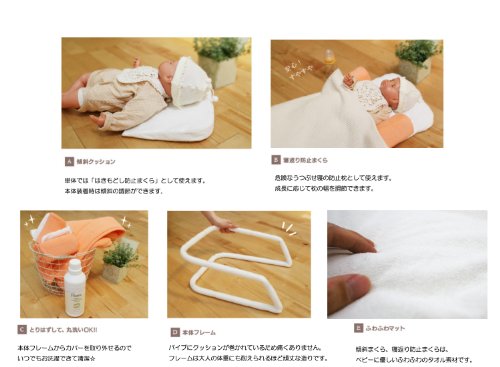 - [素材] 本体/(外側:綿80%・ポリエステル20%、内側:綿100%)フレーム:スチール・EPEパッドマット/(生地:綿80%・ポリエステル20%、中綿:PET)傾斜クッション/(生地:綿100%、中芯:ウレタン)寝返り防止まくら/(生地:綿80%・ポリエステル20%、中芯:ウレタン)