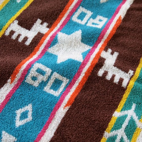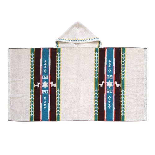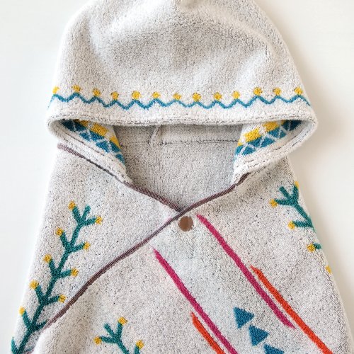 ふわふわの無撚糸で織り上げたタオル生地のポンチョ。ボヘミアン調の柄感が個性的。羽織るだけの簡単着用で、赤ちゃんのお風呂あがりやプールサイドで大活躍。大きめのサイズ感なので、大きくなったお子様やママもお使いいただけます。友人・知人やお孫さんへの出産祝いにおすすめです。