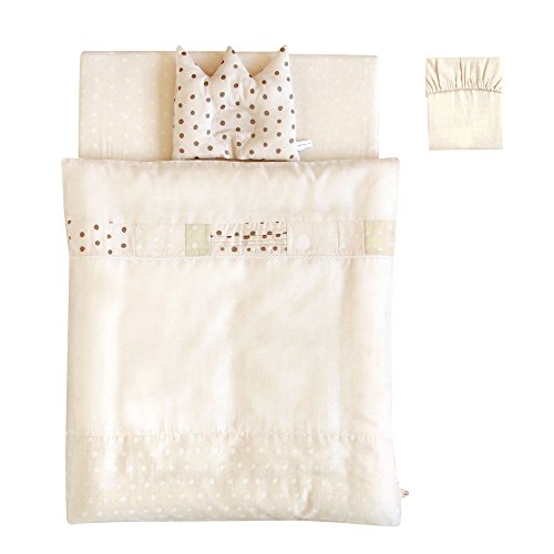 Naomi Ito(ナオミイトウ)ミニふとんセット POCHO シャンパーニュは、安心の日本製。生地はベビーにとって肌触りのいいものを、とこだわってダブルガーゼを使用しています。手描きドットのテキスタイルを使ったこだわりのデザインはどんなお部屋にもなじみます。通常のベビーふとんの約4分の3サイズ。洗い替えができるシーツも付いていて、とても使いやすい布団セットです。