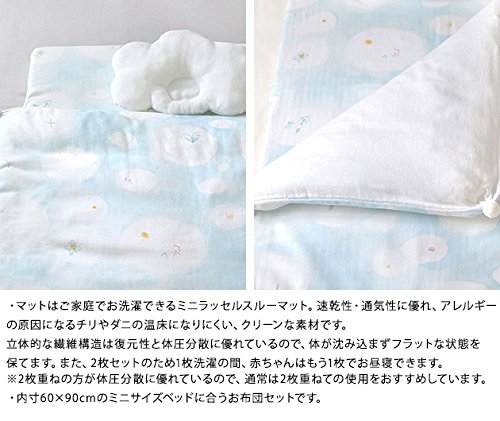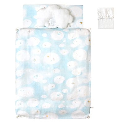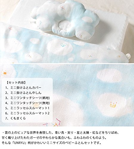 [特徴]:・雲の上のピュアな世界を表現した、青い鳥・実り・星と太陽・虹などをちりばめ、 甘く織り上げたわたガーゼのやわらかな風合いも、ふわふわのくものよう。 そんな「UNRYU」柄がかわいいミニサイズのベビーふとんセットです。