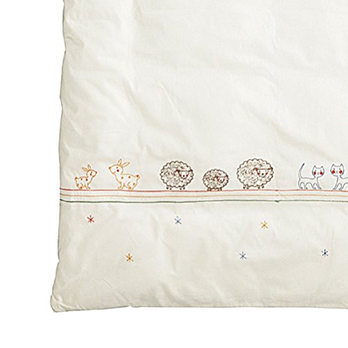 ナチュラルな生成りの生地に動物たちの刺しゅうが施してある、丁寧なつくりのおひるねふとんセット。かわいい動物たちと一緒なら、楽しい夢が見られるかも。バッグは防水コーティングを施してあるので、雨の日の持ち運びも安心。軽くて丈夫なナイロン製。保育園でのおひるね用に…など、どこへでも楽々持ち運べる、とっても便利なおふとんセット。