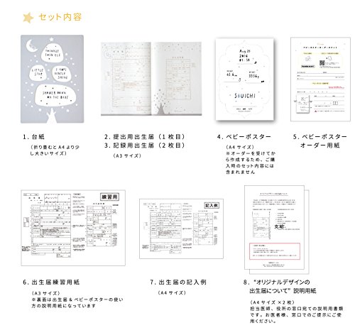 セット内容:台紙、提出用出生届(1枚目)、記録用出生届(2枚目)、出生届練習用紙、ベビーポスター、ベビーポスターオーダー用紙