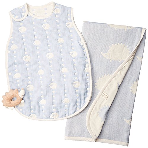 - 6重ガーゼケットとスリーパーにオーガニック素材のハリネズミのガラガラを組み合わせたベビーギフトです。