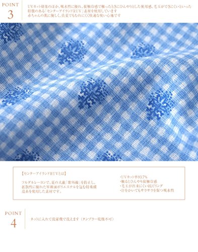 ・UVカット効果のほか、吸水性に優れ、接触冷感で触ったときにひんやりとした使用感、毛玉ができにくいといった特徴のある「センターアイランドRUV」素材を使用しています。赤ちゃんの肌に優しく、真夏でもむれにくく快適な使い心地です。夏の冷房対策やベビーの体温調節にもお使い頂けます。