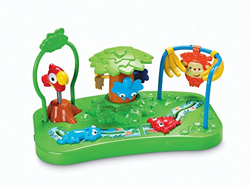 Ships in certified Frustration-Free Packaging;The rainforest booster seat is the perfect product to keep baby entertained at the table;A fun rainforest toy insert fits into the eating tray for the child to play with;Features a tree with 3 spinning bugs;Frog and a gecko slider beads on the base of the item;A colorful parrot on one side and a monkey swinging from a bead bar vine with bananas on the other;The rainforest booster seat is the perfect product to keep baby or toddler entertained at the table while the parent prepares a meal;It features a tree with 3 spinning bugs, a colorful bobbling parrot on one side and a monkey swinging from a bead bar vine with bananas on the other