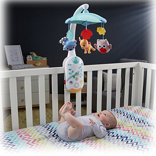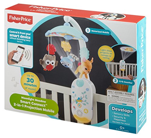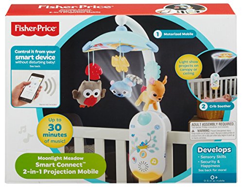 Control the mobile or crib soother from your smart device;Download the Smart Connect app to control motorized mobile action, up to 30 minutes of music, white noise and nature sounds, projection light show and amber nightlight;For issues, please call Fisher-Price Customer Service: 800-432-5437;A canopy light show as they grow: -Younger babies watch the light show on the mobile canopy -Older babies enjoy the show projected on the ceiling overhead; Three plush overhead characters, including a friendly owl, fox and raccoon;Three music & sound options: lullabies, white noise, or nature sounds; Music, sounds and light show projection help develop baby's senses