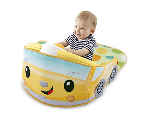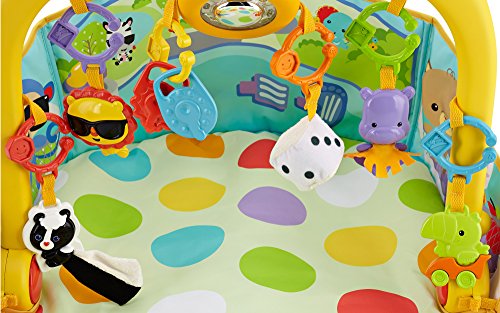 3 ways to play that grow with baby; Lay and Play, Tummy Time and Sit and Drive;20 minutes of music and lights;8 movable activity toys: key clackers, hula hippo, jingling fuzzy die, lion rattle, toucan teether, skunk air freshener (vanilla scented), and steering wheel with music, lights and sounds (and a mirror in the middle);Large, machine-washable play mat;Helps get motor skills rolling along nicely