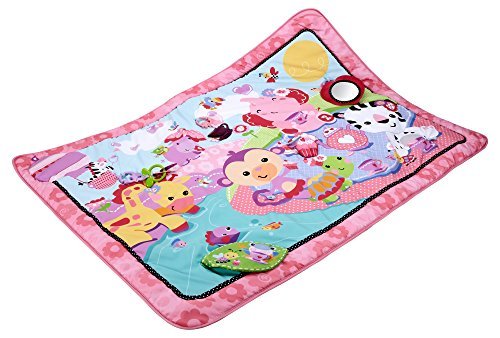 Extra-large play space (almost 5' long);Encourages baby to roll, push up and explore;Great for lay and play or tummy time;A pink tea party scene with pretty colors and patterns;Five interactive toys and activities include a heart mirror, plush cupcake with jingle, flower clacker, teacup teether and crinkly, peek-a-boo leaf
