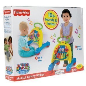 10+ sounds and tunes! Sturdy design for beginning walkers;Sit and play fun! Music, songs and activities to enjoy;Add to the thrill of learning to walk, with exciting musical accompaniment!;Children can play by sitting or by standing and walking--both let your baby explore the many activities offered by the Fisher-Price Musical Activity Walker. Kids can flip the guitar toggle, turn the tambourine dial, bat and spin the maraca, and push on the saxophone to hear real horn sounds. Babies will strengthen their balance and coordination as they play and explore.;Assembly Requirements: Requires three AA (LR6 Alkaline) 1.5-volt batteries (not included). Adult assembly with a Phillips screwdriver (not included) required.