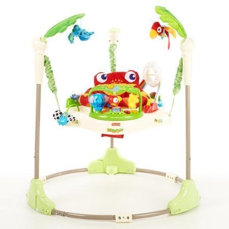 Baby jumper toy maximum weight 25 lbs.; maximum height: 32;Fisher-Price Rainforest Jumperoo seat rotates 360 degrees making five fun toy locations accessible to baby;Electronic toy in front has motion music and lights that baby can activate;Fisher-Price jumperoo has three height adjustments for extended use;Safe jumping fun for baby