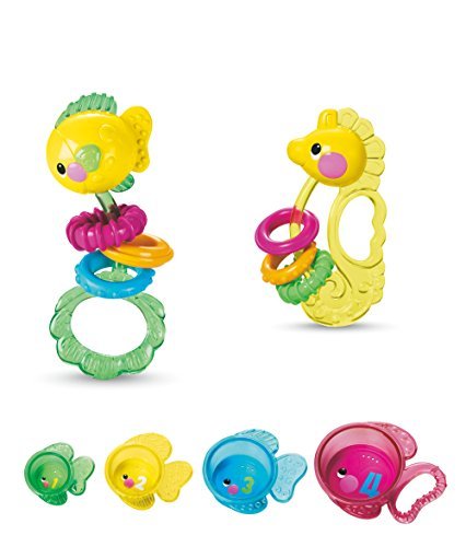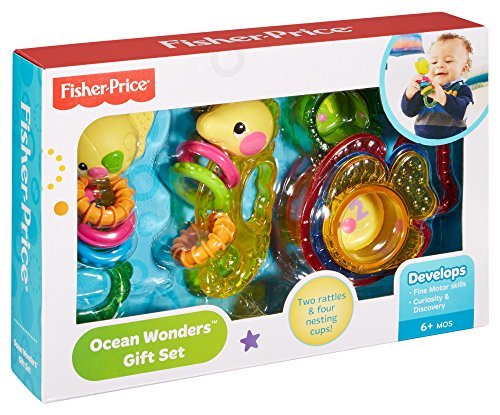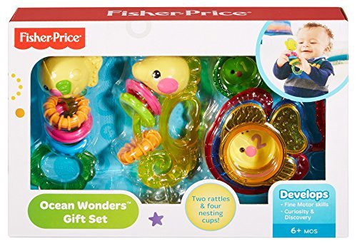 Colorful fish and seahorse Ocean Wonders Dumbbell Rattles with big, textured clacker rings and easy-to-grasp handles help stimulate baby's senses of sight, sound, and touch with every motor skill-building shake. And a set of 4 fish-shaped Ocean Wonders Stacking Cups that nest one-inside-another or stack biggest-to-smallest introduces baby to relative size and shape-with numbers inside each colorful cup that introduce numbers and counting, too.