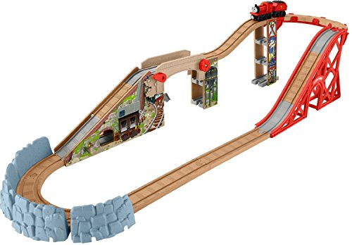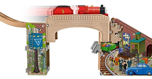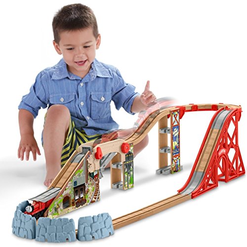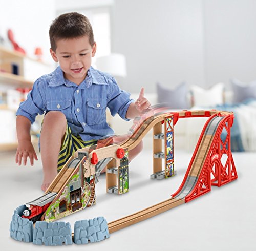 It's the highest Wooden Railway track set yet! Inspired by the upcoming Thomas & Friends DVD, Start Your Engines, lift the barrier to send James through the hidden mountain tunnel out the bottom. Lower the barrier to send James over the mountain. The included track risers have built-in extenders so you can easily expand your world. Includes James engine and tender.