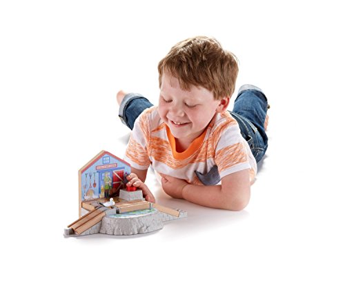 The hungry duck is ready for a special treat! It crosses the track to get feed from McColl's Feed & Grain supply. When it's had its fill, it crosses back over the tracks heads back into the pond for a nice little swim! This all-in-one Wooden Railway destination set with special feature activated by pushing down on the feed barrel can be attached to any Wooden Railway set or layout (sold separately and subject to availability).